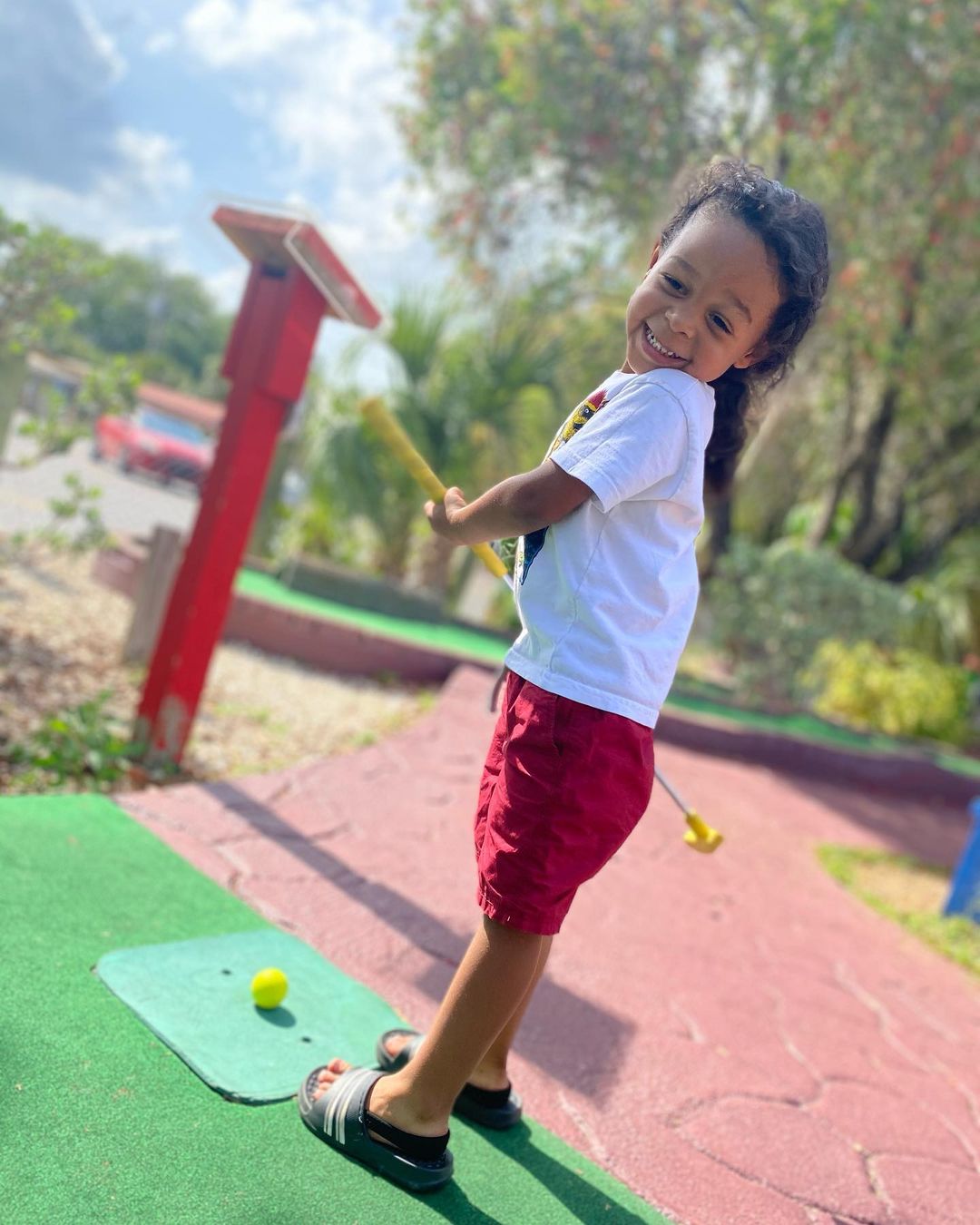 A couple golfs in the putting green