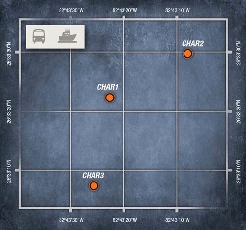 Individual Plots: CHAR1: 26-33.374N, 82-43.368W Railroad Hopper Cars CHAR2: 26-33.498N, 82-43.128W Railroad Hopper Cars CHAR3: 26-33.130N, 82-43.415W Vessel TWBARG: 26-29.975N,82-43.468W Barges |