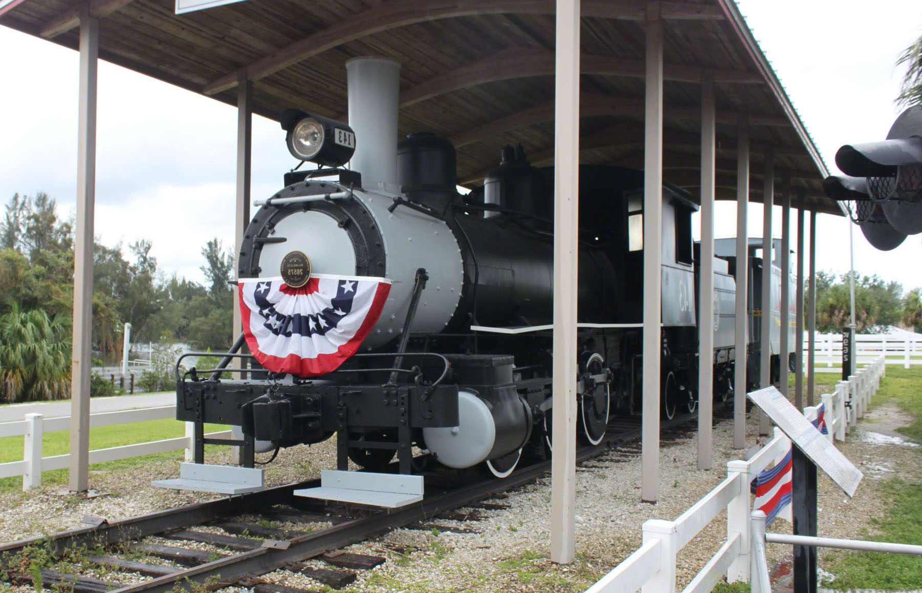 There the locomotive was put to use in the phosphate mine industry hauling trains from the mines to the main line railroads. It finished its operational career in 1959. It was subsequently put on display outside the Company's office in Pierce. From there it went to a short-lived tourist line (in Trilby, FL?). In 1974, the locomotive was donated to the Tampa Bay Chapter of the National Railway Historical Society and moved to San Antonio, FL. It's tender was re-attached to 143. Photo courtesy Michael Mulligan. 1979, it was donated to a private citizen and moved to Tampa. The #143 was then acquired by the Florida Gulf Coast Railroad Museum. In 1992, the Floida Gulf Coast Museum was told to move the derelict locomotive from the storage site in Tampa. Lacking funds to move the #143, the FGCR offered the #143 to the newly established Railroad Museum of South Florida located in Ft. Myers. At a cost of $16,000, the #143 was loaded on to a truck trailer and hauled to Ft. Myers. For over two years the #143 was stored under roof at Dean Steel Buildings. It was relocated to the Railroad Museum of South Florida at the Lakes Park and Gulf Railroad Train Village in 1995. In 2001 Lee County Parks and Recreation in conjunction with the Railroad Museum of South Florida announced the completion of the cosmetic restoration of historic locomotive #143.